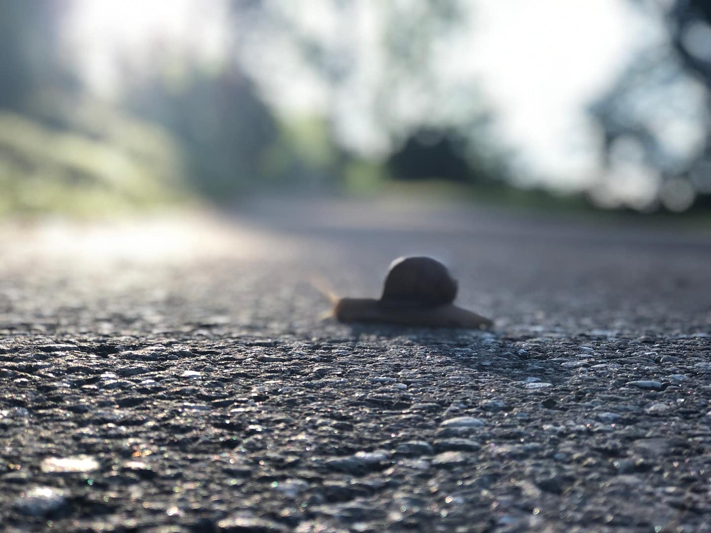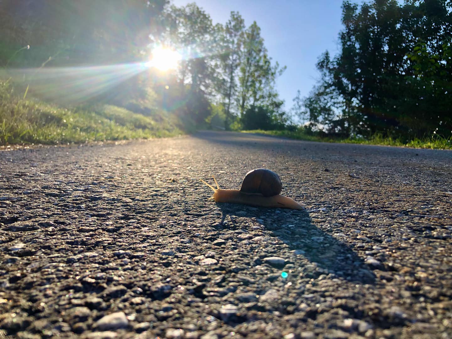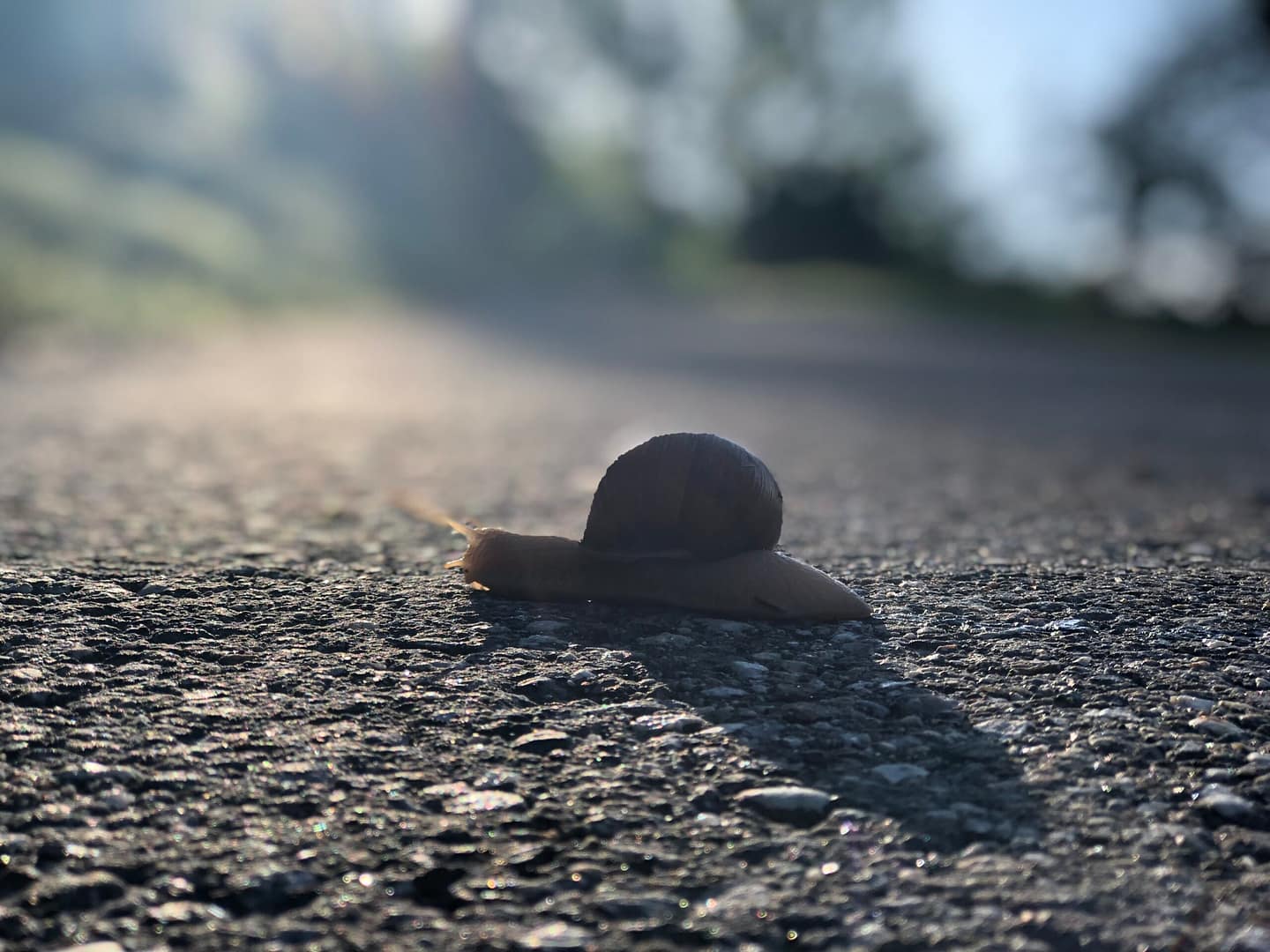 Also endlich mit dem Hund auf unserer gewohnten Morgenrunde sehe ich plötzlich mitten auf der Strasse diese Schnecke. Die Morgensonne gibt dem ganzen Bild den perfekten Rahmen und ein Impuls zwingt mich stehenzubleiben und die Handykamera zu aktivieren und ich beginne Fotos zu machen. Zuerst eins, dann zwei, dann drei, dann vier....diese verdammte Schnecke ist einfach nicht fotogen ärgere ich mich. Ich bin mit keinem der Bilder wirklich zufrieden. Ich mache am Boden kriechend noch weitere 4-5 Bilder. Am Schluss fällt das Licht nicht mehr so schön und ich verzweifle langsam weil mir das perfekte Bild nicht gelingen will.