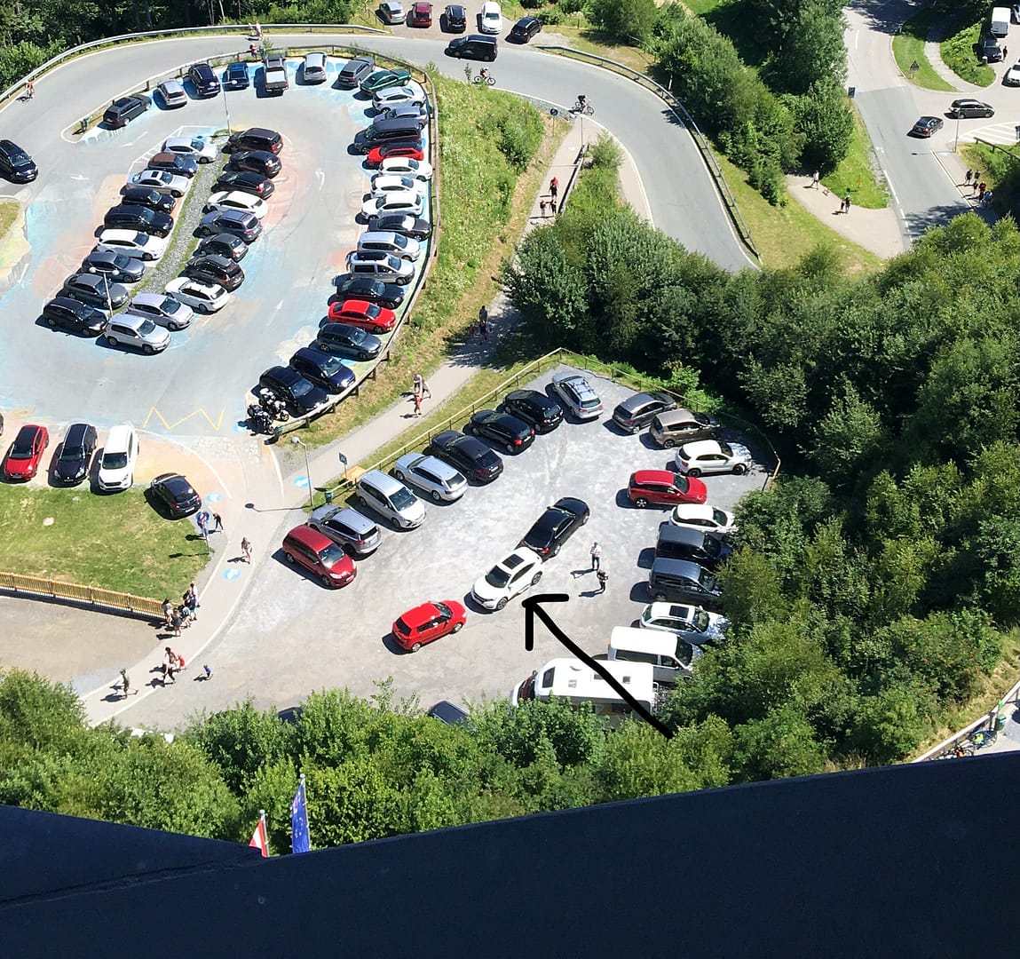 Noch während ich die unzähligen Treppen der Aussichtsplattform hinaufsteige, kann ich von oben schon eine weitere Person mit einem schwarzen Auto beobachten, die sich zum kreativen Parken direkt hinter mir inspirieren hat lassen. Kurz bevor wir oben die Plattform erreichen folgt schon das dritte Auto in rot und parkt direkt vor meinem weißen Honda und mein Herz hüpft fröhlich. Ich bin nicht allein. Ich habe FOLLOWER, sozusagen Fans, die meine Idee super finden.